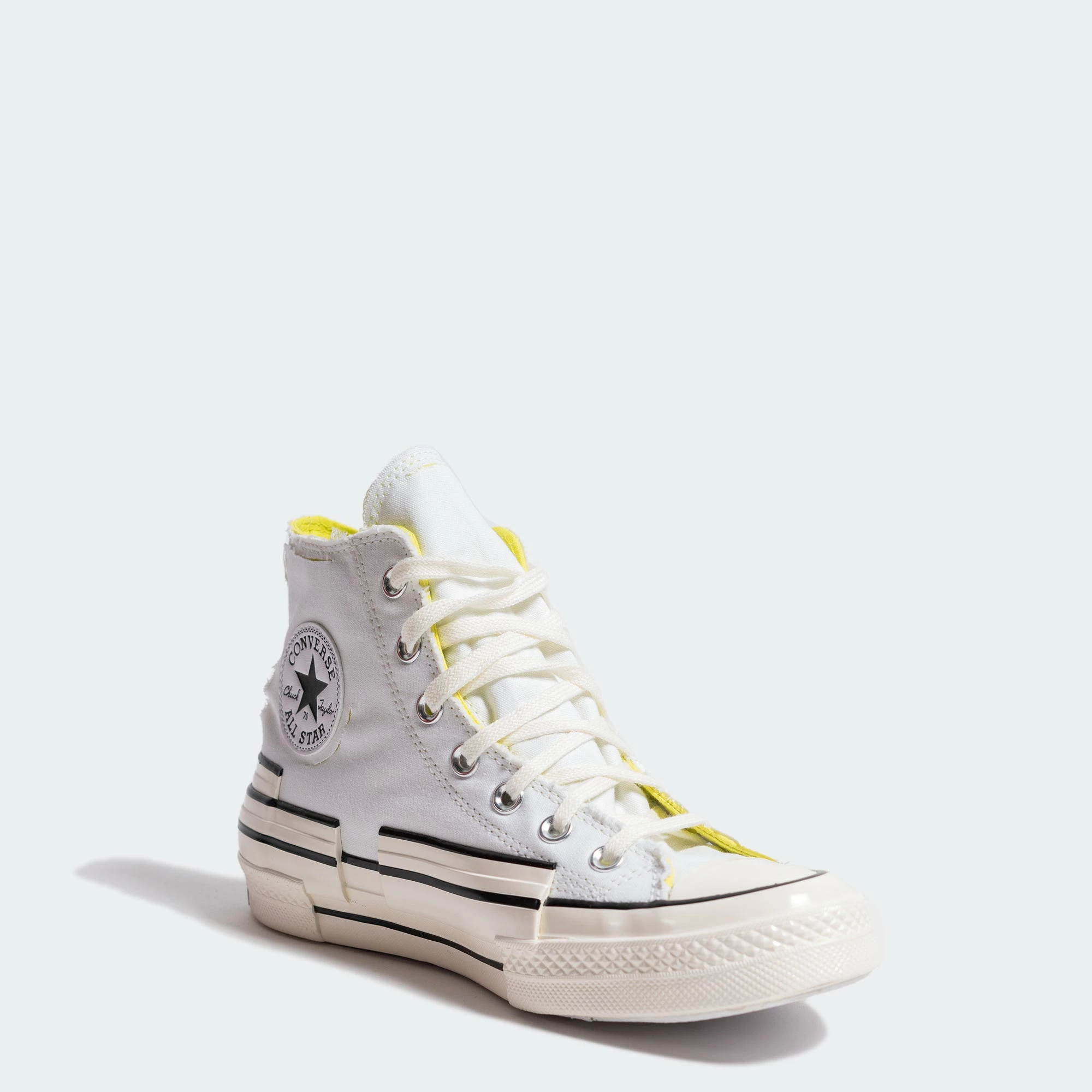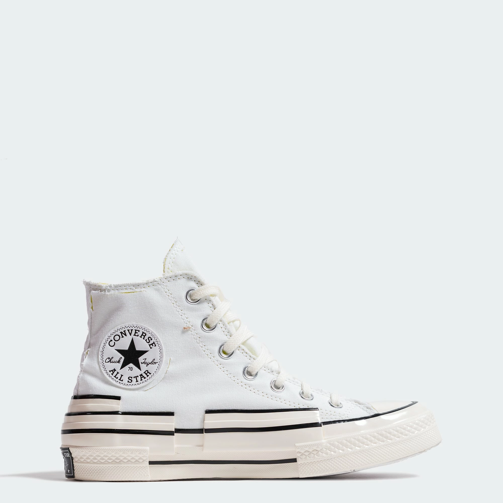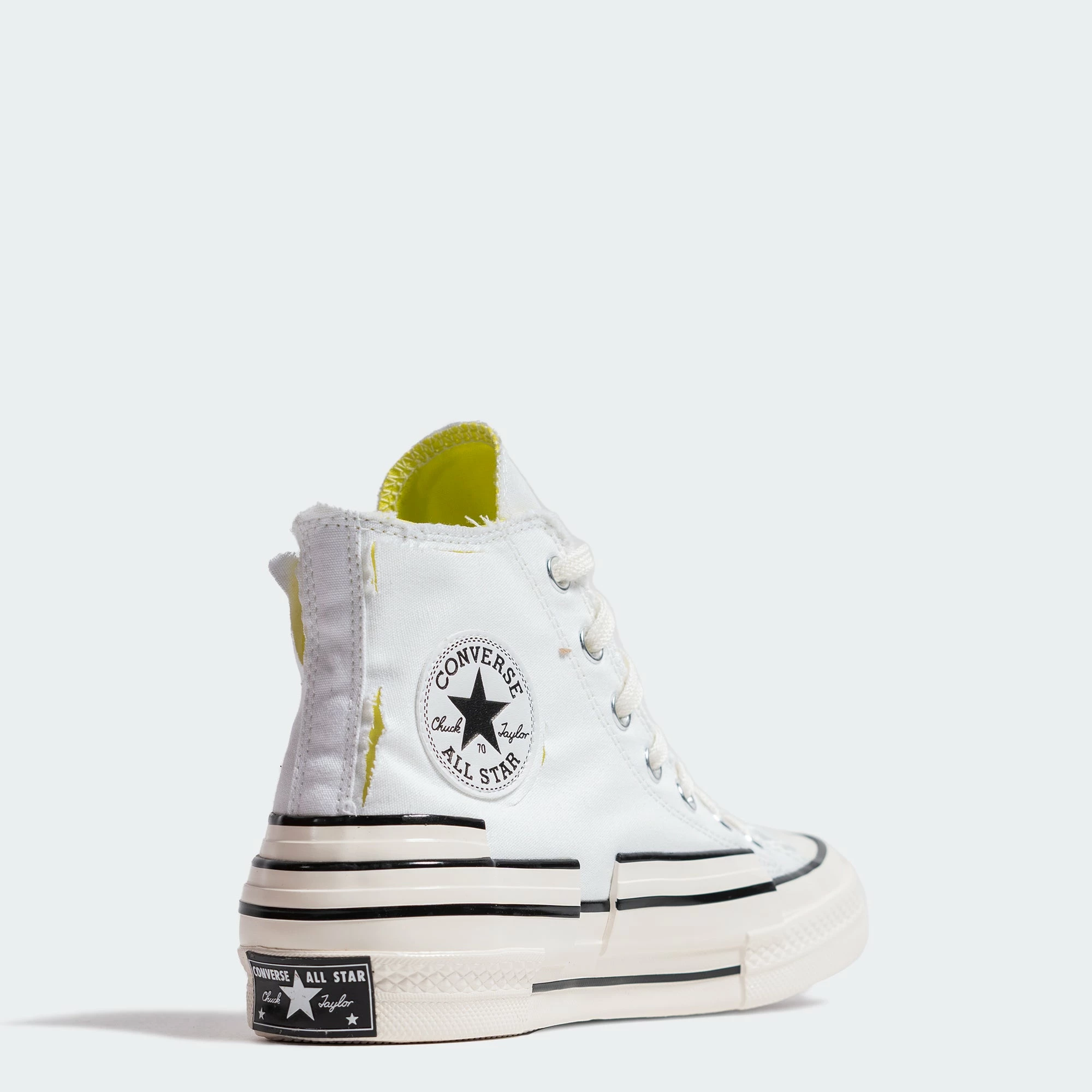 As you please. The Converse Chuck 70 Hacked Heel Tear Away High Tops are designed with a tear-away upper that reveals a bright yellow base color. Tear away as much or as little as you want. The Converse Chuck 70 comes with a triple stacked heel and foxing tape with a glossy look and premium cotton laces.