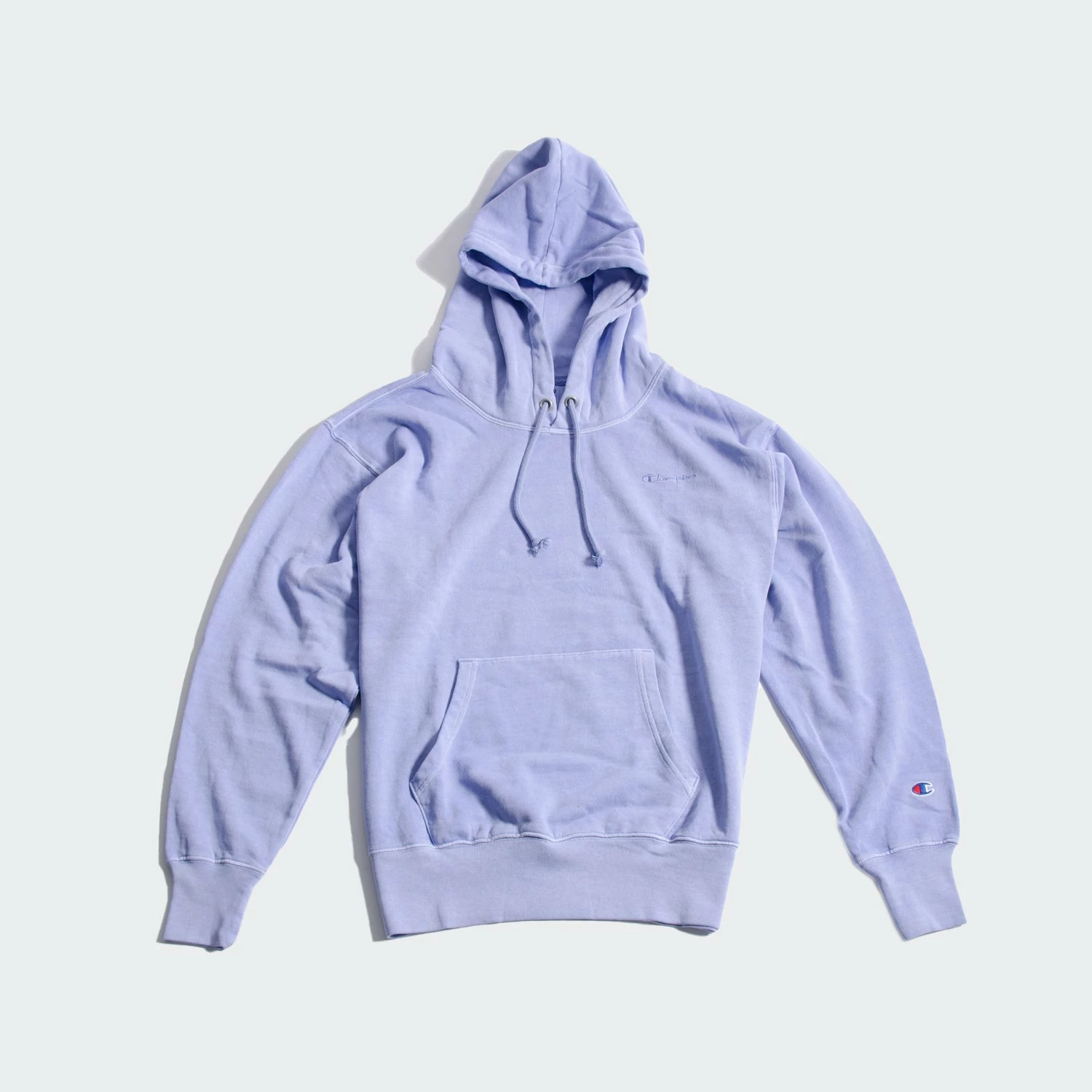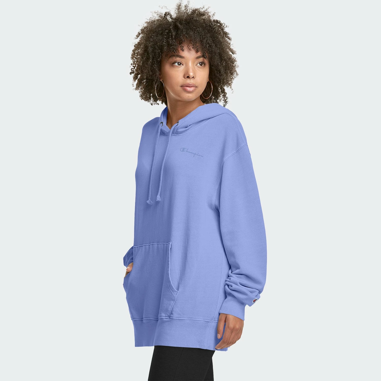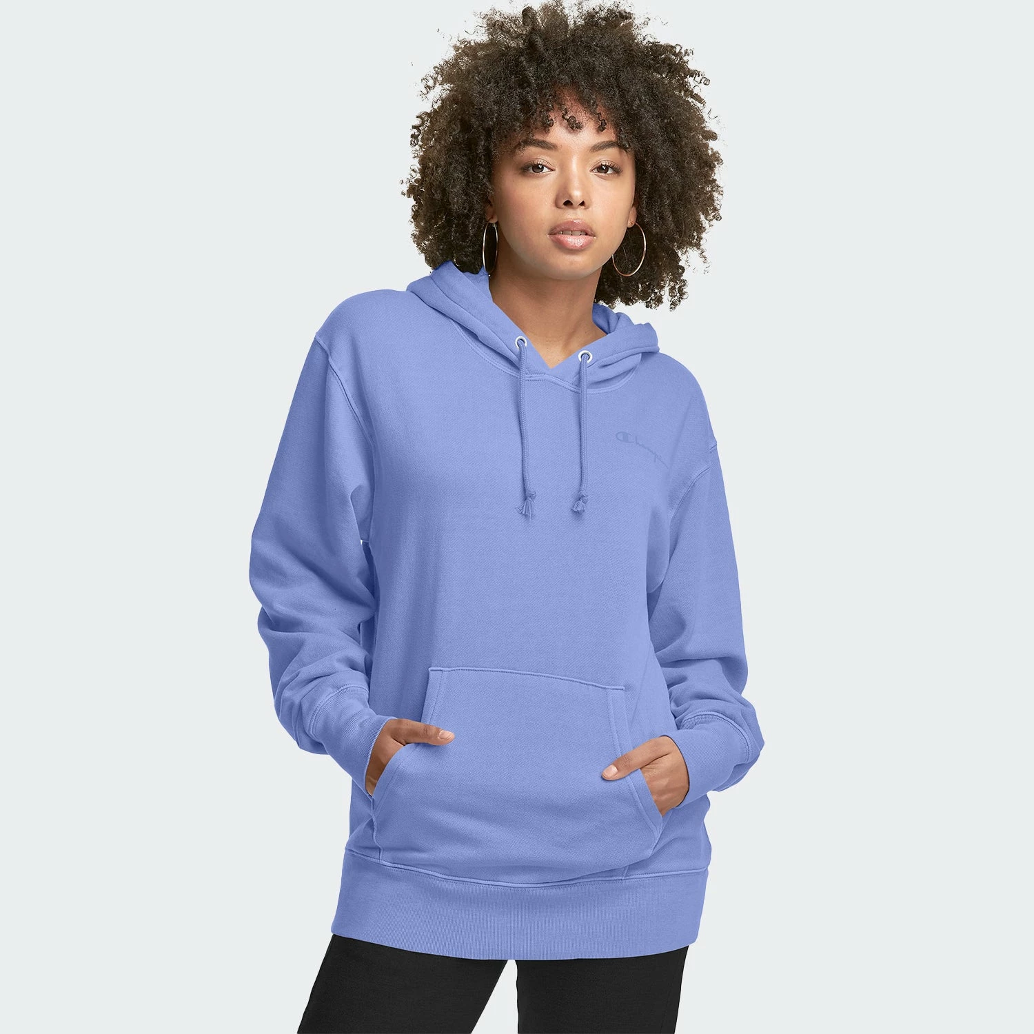 Kick back, relax and throw on a lighter weight Champion hoodie for the perfect, casual look. With an oversized, looser fit, layer underneath with your favorite pair of jeans, leggings or shorts. The hooded sweatshirt features the Champion logo on the chest in a tonal palette. Comes in a chill Charming Blue hue.